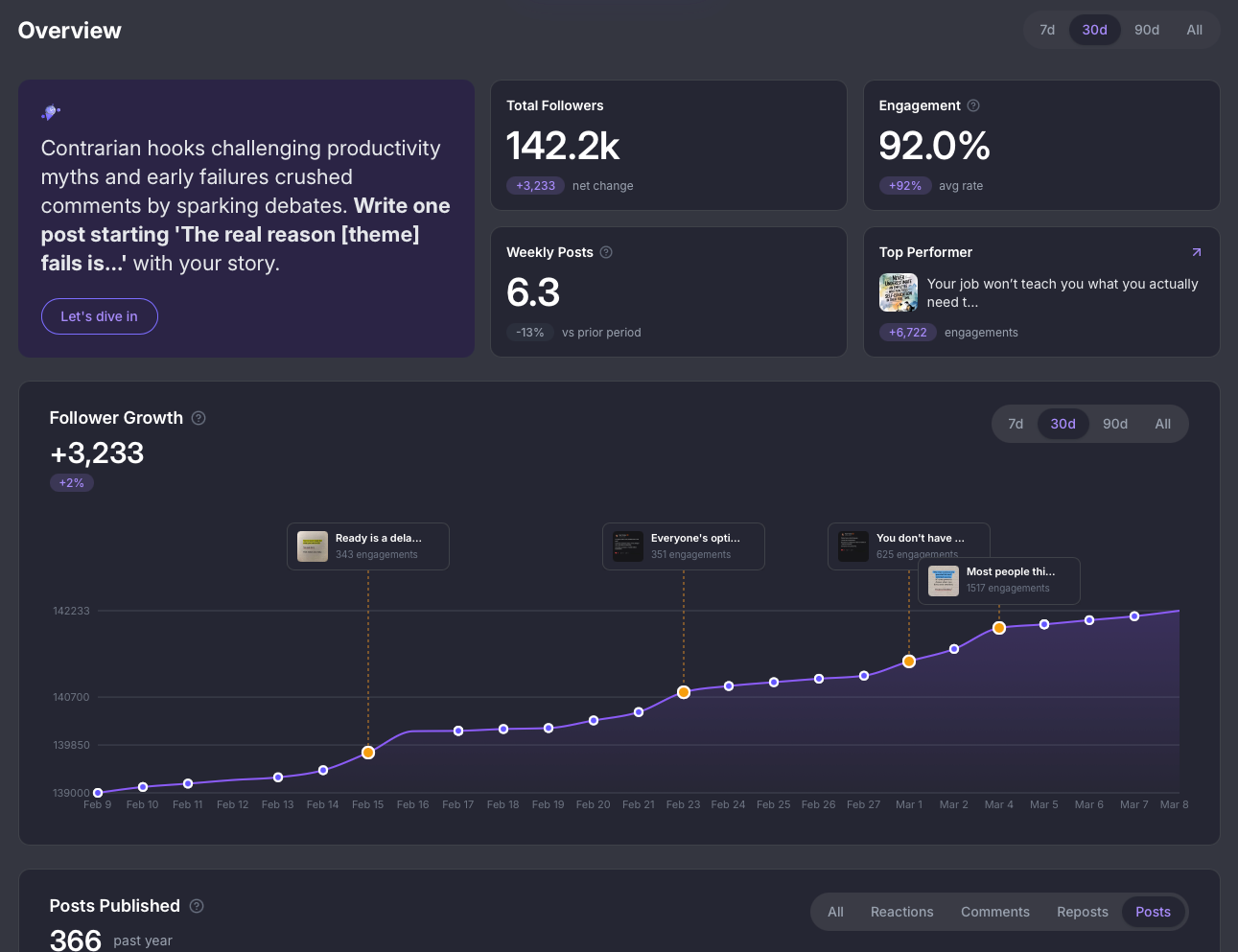 What the data revealed that surprised me: contrarian hooks challenging productivity myths consistently outperformed everything else. Not motivational content. Not tactical frameworks. The posts that pushed back on something which started more conversations are what drove both reach and follower growth simultaneously.