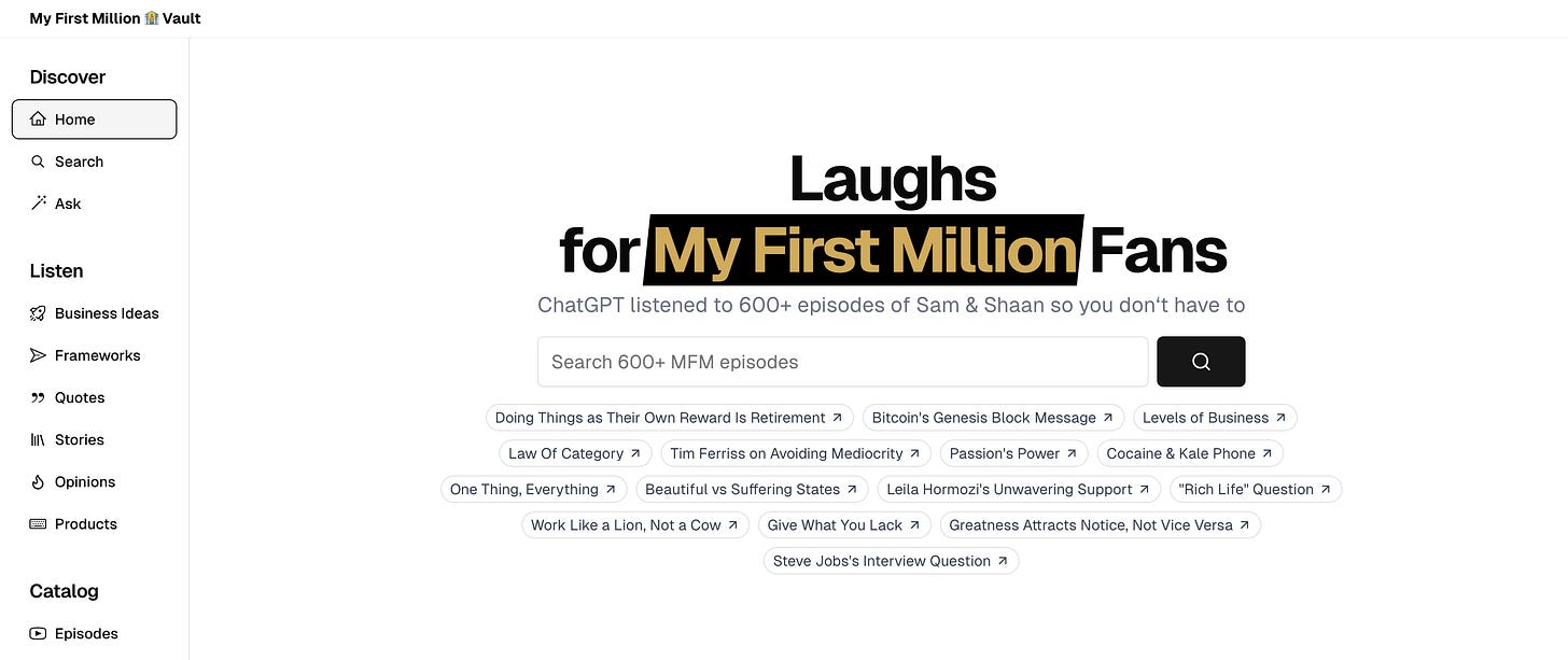 I found what I consider an incredible resource. My First Million is a podcast run by Shaan Puri and Sam Parr. They typically have guests who have more obvious than not made their first million and made it to that inflection point.